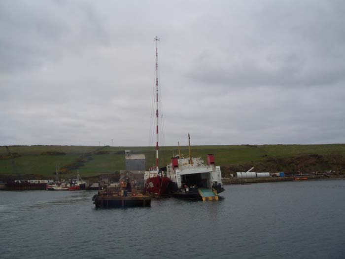 Versus Chris Faulkner I’ve got some photographs taken, earlier this month, by Alan Porter (thanks). The former radio ship from Laser 558 and Laser Hot Hits is still in the harbour of St Margarets Hope in Orkney.