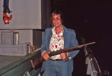 Talking about memories related to RNI, there’s a story about the last days. The Dutch team, who normally were recording the programs in the studios in Naarden, were invited to do live programming from the MEBO II to give a better atmosphere in the programs. one of the deejays was Ted Bouwens, who hadn’t been on the ship too much. The told him that during dark hours the ship had to be guarded as many times intruders wanted to come aboard the MEBO II. So Ted got his own time share to guard the MEBO II. And suddenly, when he was armed, he looked a bit scary! After more than 31 years this Polaroid Picture, which has never been published before, is offered to be shared with you!Photo: Ted Bouwens on the Mebo II (Copyright: Pieter Damave)