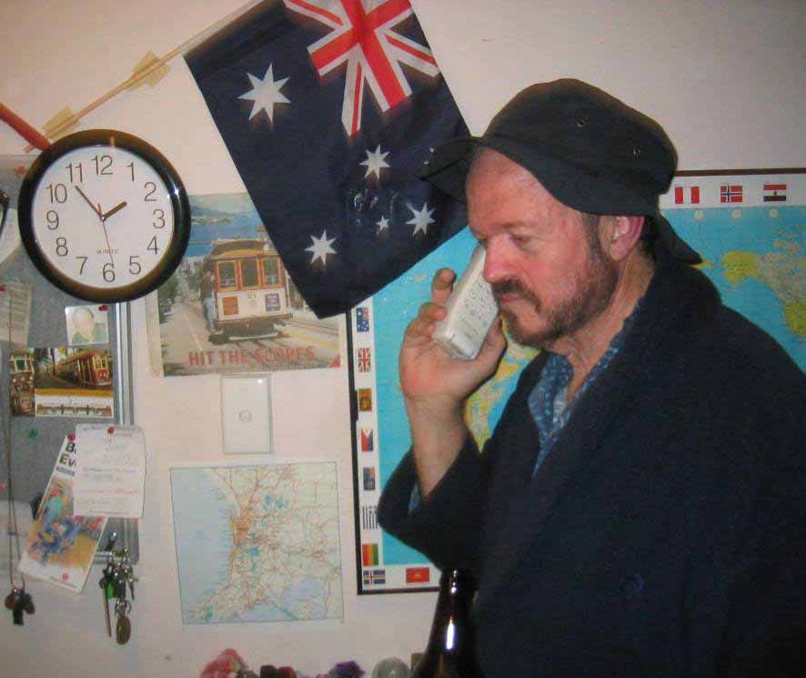 Hmm some of the people who attended halfway May the official SRE reunion have begged me to come to the Red Lion in London to share the memories. I would love to have done it but as I had other commitments during that weekend I asked a good friend since 1971, Chris Edwards from Offshore Echoes Magazine, to go to Mayfair and make some interviews for further publications. However it was another person who couldn’t attend who sent in from Australia an e-mail, some comments and photos shot by his stepdaughter Brynna McPherson. Station manager Jack Curtis, who got a lot of deejays a job on the five stations aboard the Olga Patrica, aka Laissez Faire, originates from the USA and is nowadays living in Australia. He wrote to me: ‘I guess you didn't make to the Red Lion Pub either. As promised I participated by phone and a PA system to speak to the assembled horde. It was just coming up 2am here when we connected. Darn shame Graham Gill didn't manage to attend. Perhaps I can get to one of your Radio Days in Holland sometime.... here's the Down Under view as taken by a very understanding family member. Photo: Jack Curtis on the phone to Rick Randell
