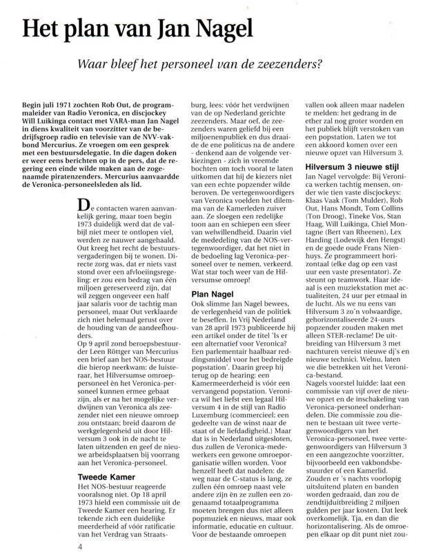 In het magazine "Aether" verscheen in 1994 een uitgebreid artikel onder de titel "Het plan Jan Nagel: waar bleef het personeel van de zeezenders?". Het artikel beschrijft uitgebreid de eerste contacten tussen Radio Veronica medewerkers en Jan Nagel van vakbond Mercurius, het "Plan Jan Nagel", het einde van Radio Veronica en Radio Noordzee en de toekomst voor de zeezender medewerkers. Het artikel staat nu online.