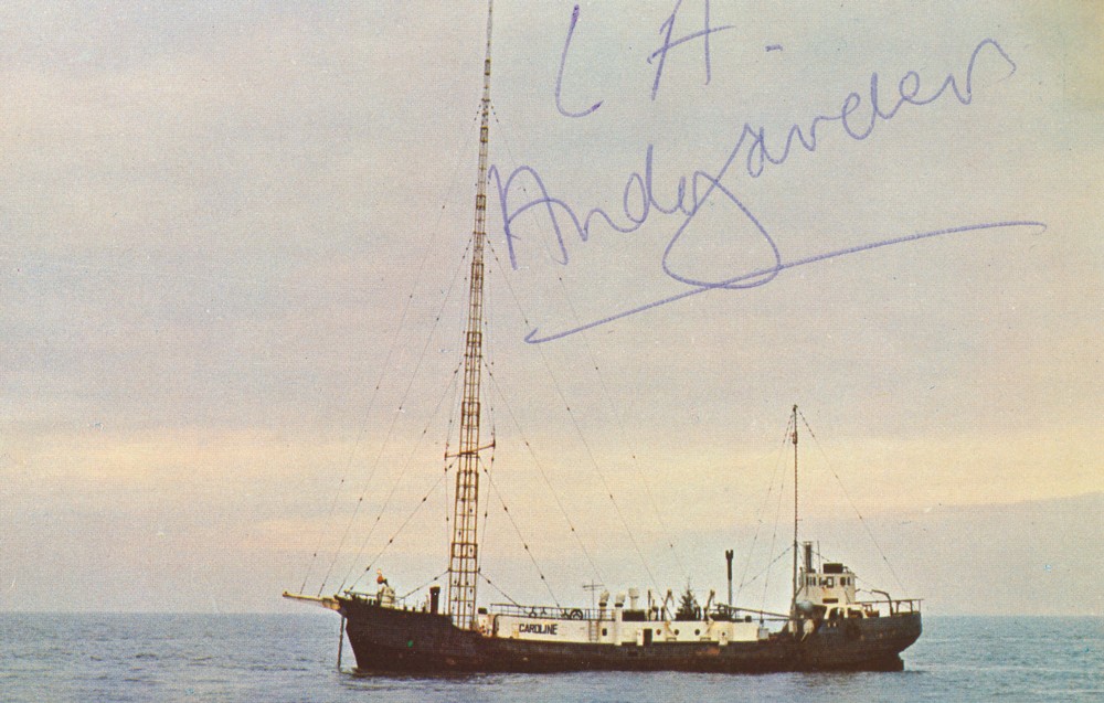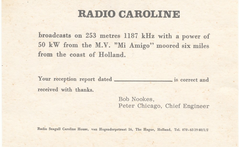 Daarnaast vond ik een Radio Caroline QSL kaart (rechts & links onder) die ik nooit eerder heb gezien en waarvan ik denk dat deze nooit is uitgebracht. Er lag een aantal van in blanco enveloppen. Op de achterkant een tekst waarbij de naam van Bob Noakes ook nog eens verkeerd is gespeld. Wie heeft deze kaart eerder gezien, mag het me melden.KLIK HIER voor meer informatie over Graham Gill op de Pirate Radio Hall of Fame (60's)